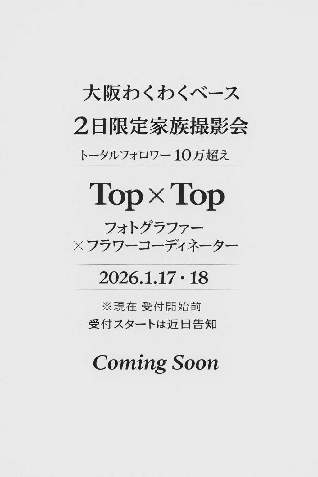 全国でも大人気の予約がなかなか取れないTOPフォトグラファーで当社BOSSも自分の家族写真を依頼している×当社スタジオフラワーベース等手掛けて頂いている花いちもんめさんとの2日限りの特別装飾にて家族写真撮影会を予定しております