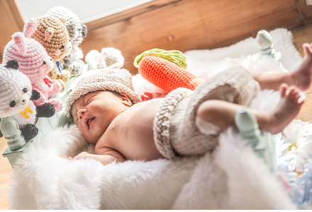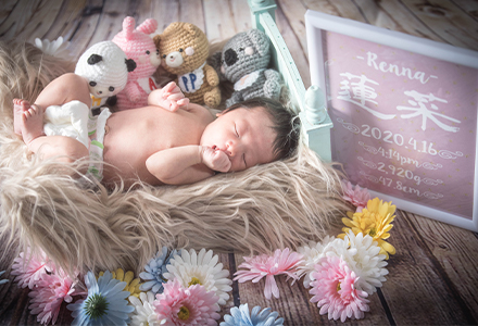 撮り頃は生まれてから20日内。新生児の赤ちゃんの眠る姿を自然にお撮りするニューボーンフォト。初めて出会った時の気持ちがいつでもよみがえってきます。みるみるうちに体型が変化してゆく赤ちゃん。等身大パネルでいつまでもその時の姿が見れます。出張での撮影も可能です。